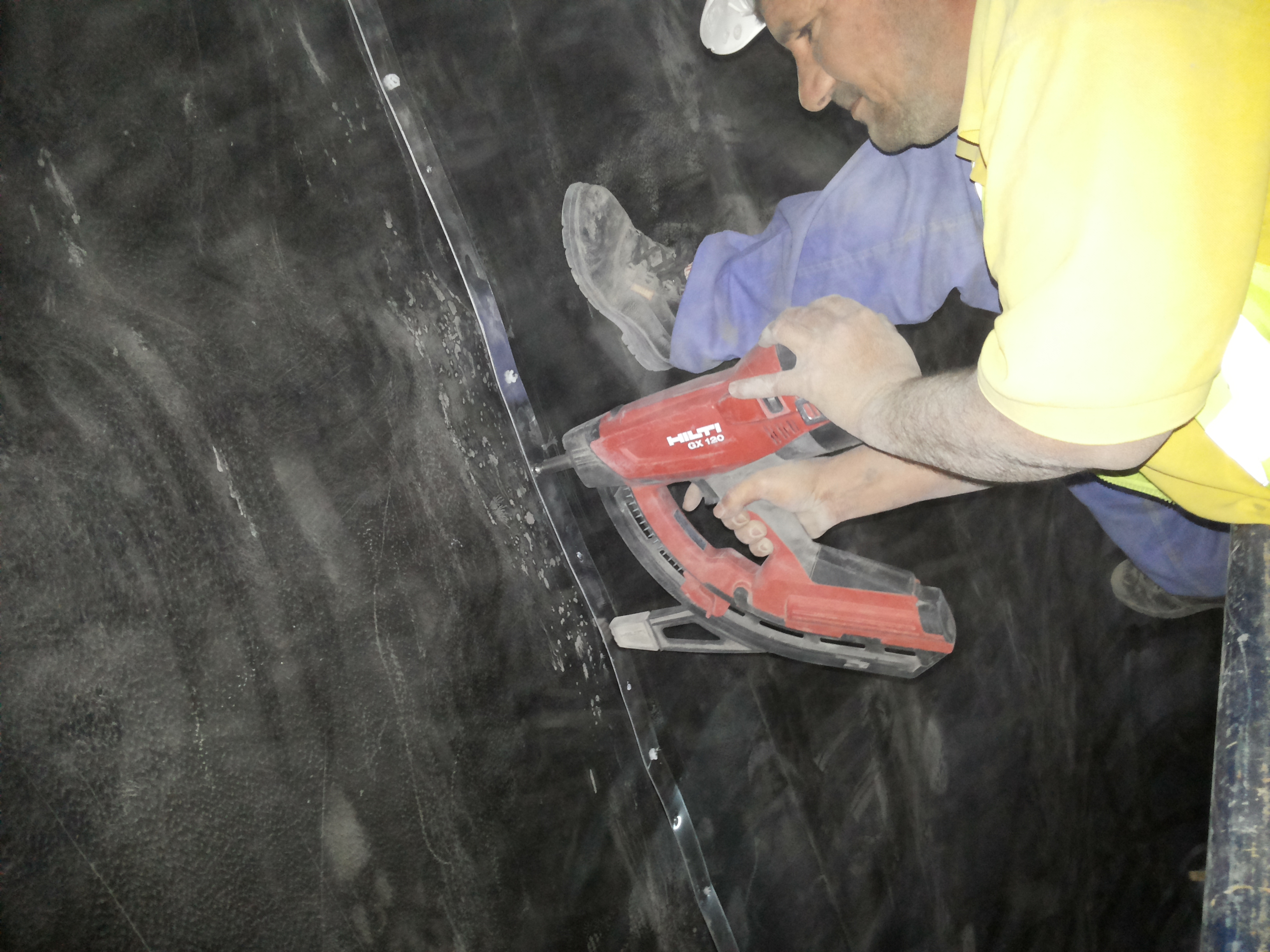 - Fixing 1.5mm thick HDPE sheet by mechanical fixation using aluminum strip, nails and cartridges.
